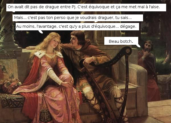 Dans l’approche immersionniste, hors de question de se satisfaire d’un « Tu aimes X parce que c’est dans ton BG » ou « parce que c’est le propos du jeu » ou « parce que tu as raté ton jet de Volonté ». Il va falloir être séduisant… dans la fiction.